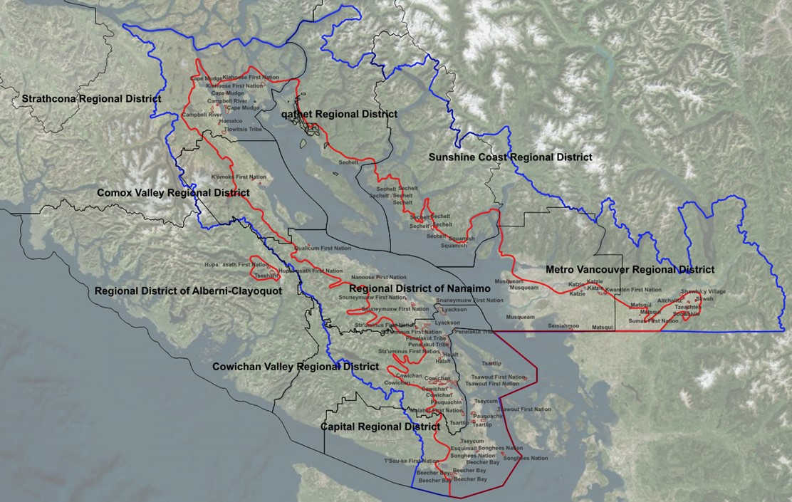 The Red boundary depicts the CDFCP focus area – which is the Salish Sea’s dry lowlands comprising Coastal Douglas Fir and associated ecosystems.