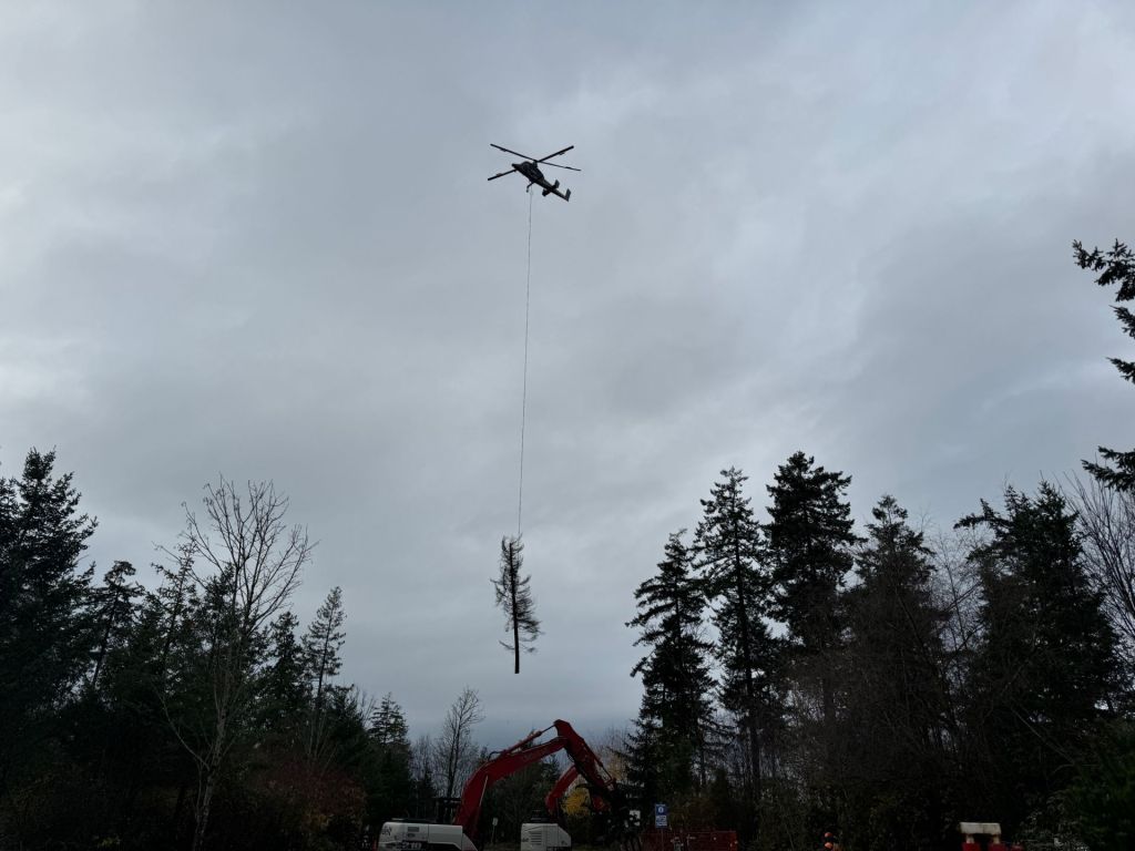 Tree removal had to be done carefully. All the trees removed from Stanley Park were hand-felled by a team of tree climbers. The trees are removed piece by piece so as to not damage surrounding trees and infrastructure. In some cases, portions of trees were cut and then removed using a zipline system. Some trees were cut and left standing to act as wildlife trees and snags. The trees were loaded onto a log forwarder that operated on trails and brought them to one of the sorting areas within the park. Of the removed trees, Douglas-fir and Western red cedar were shared with the local First Nations to be used for cultural practices, fine fuels were sent to a bio-products facility to be disposed of, and trees unsuitable as saw logs were sold for pulp. In areas of the park that were hard to reach, such as above the seawall, helicopters were needed to remove the trees.