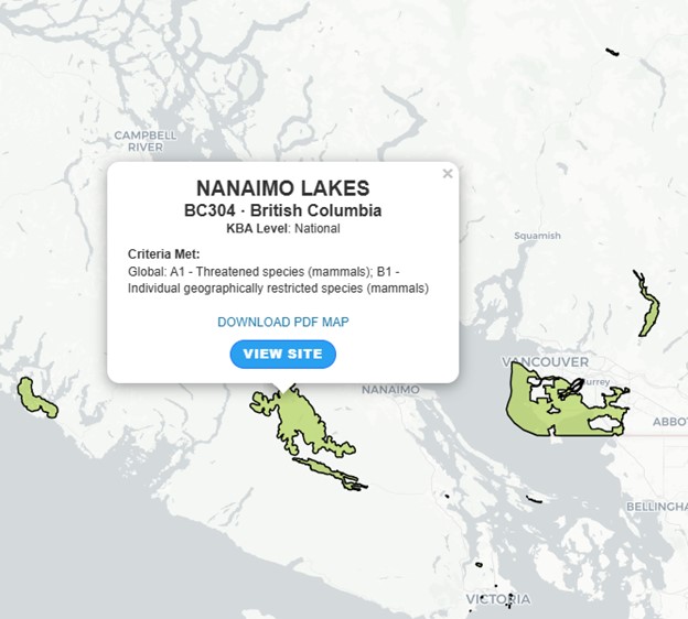 Key Biodiversity Areas (KBAs) located on the south west coast of BC.